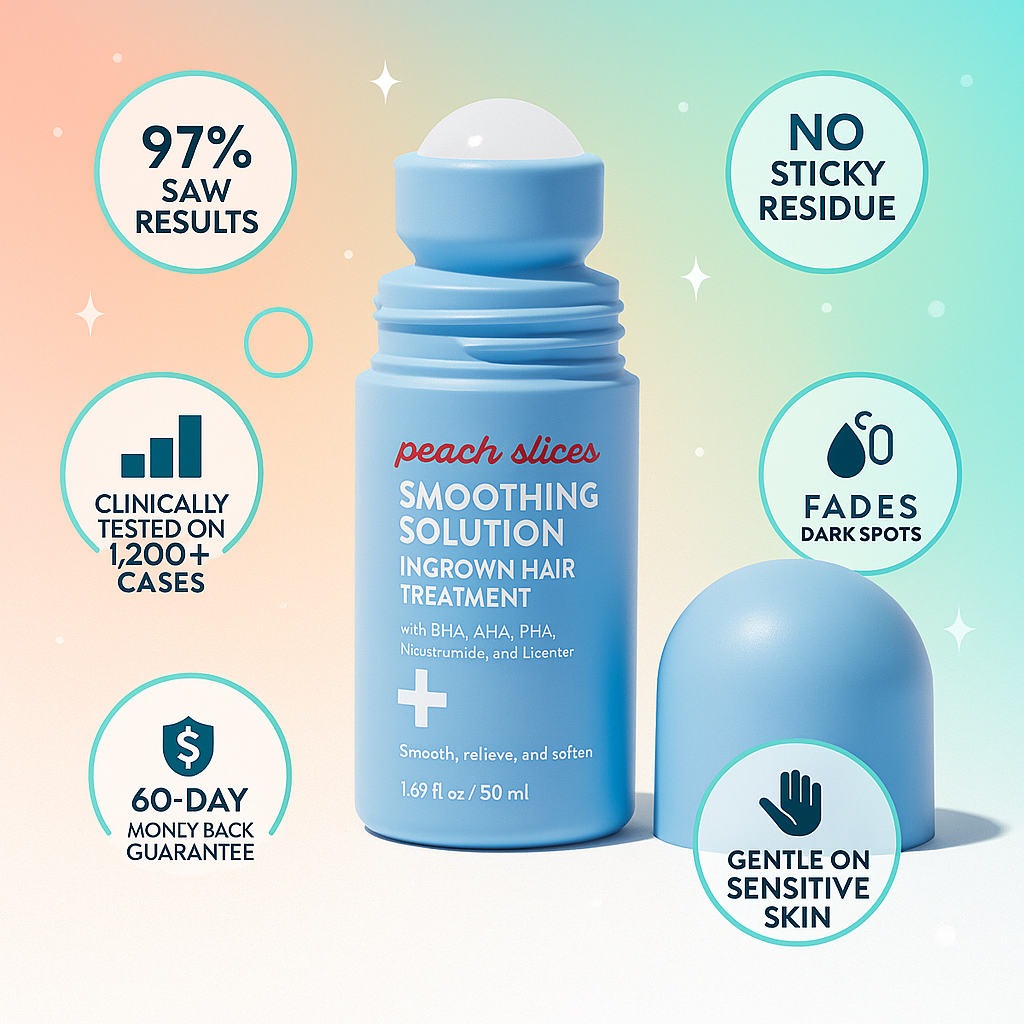 Finally, a treatment that actually works—and won’t sting, burn, or leave your skin sticky. The Peach Slices Smoothing Solution uses dermatologist-backed ingredients like BHA, AHA, and Niacinamide to gently exfoliate, brighten, and calm irritation. The mess-free roller glides on smoothly, dries fast, and is safe for even the most sensitive areas. Clinically tested on over 1,200 cases with 97% seeing real results, it’s the natural, pain-free way to get clear, bump-free skin.